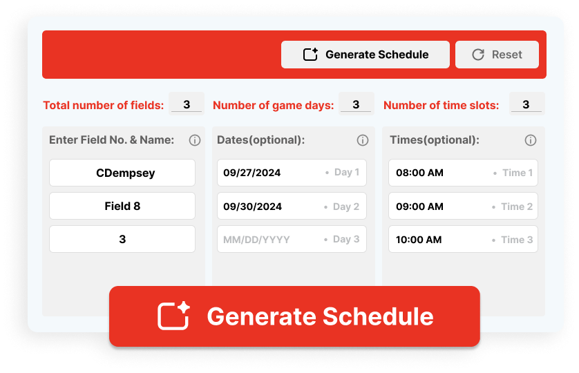 Enter the field name and number, then select the day and time to schedule games as needed. Scheduling games can be a daunting task, but our sports schedule generator simplifies the process. Just input your league's information, choose your preferred format, and let our generator handle the rest.